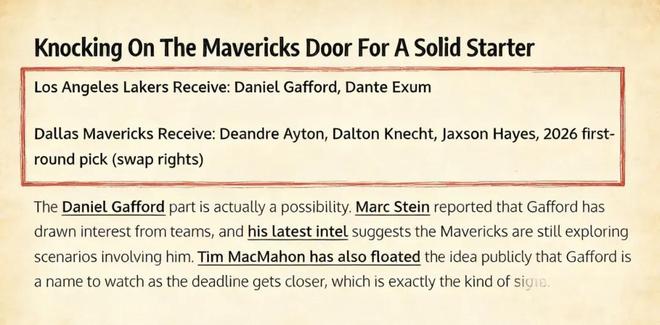 相比之下,湖人更希望引入一位能在防守端穩(wěn)定貢獻(xiàn)的內(nèi)線(xiàn)球員。據(jù)NBA記者Jake Fischer報(bào)道,獨(dú)行俠中鋒加福德正是湖人尋求的替代選項(xiàng),他甚至為湖人設(shè)計(jì)了一套交易方案——