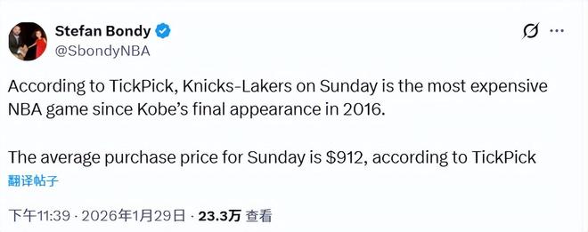 據(jù)票務平臺Gametime的數(shù)據(jù)顯示,湖人和尼克斯這場比賽的平均票價已高達912美元,這是自2016年4月13日科比退役之戰(zhàn)(當時平均票價為1049美元)以來,NBA常規(guī)賽票價的最高紀錄。而這場比賽的最低入場票價也達到了457美元。