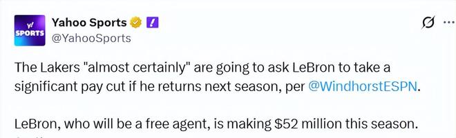 名記文霍斯特表示:“賽季結束后——無論湖人的賽季何時落幕——詹姆斯都要面臨兩個重大抉擇。第一,他是否要再打一個賽季。而他的態(tài)度也很明確,他自己目前也沒有答案,對此我是相信的。第二,如果他決定再戰(zhàn),他愿意接受多少薪資。因為湖人幾乎肯定會要求他降薪,而且幅度可能還不小。”